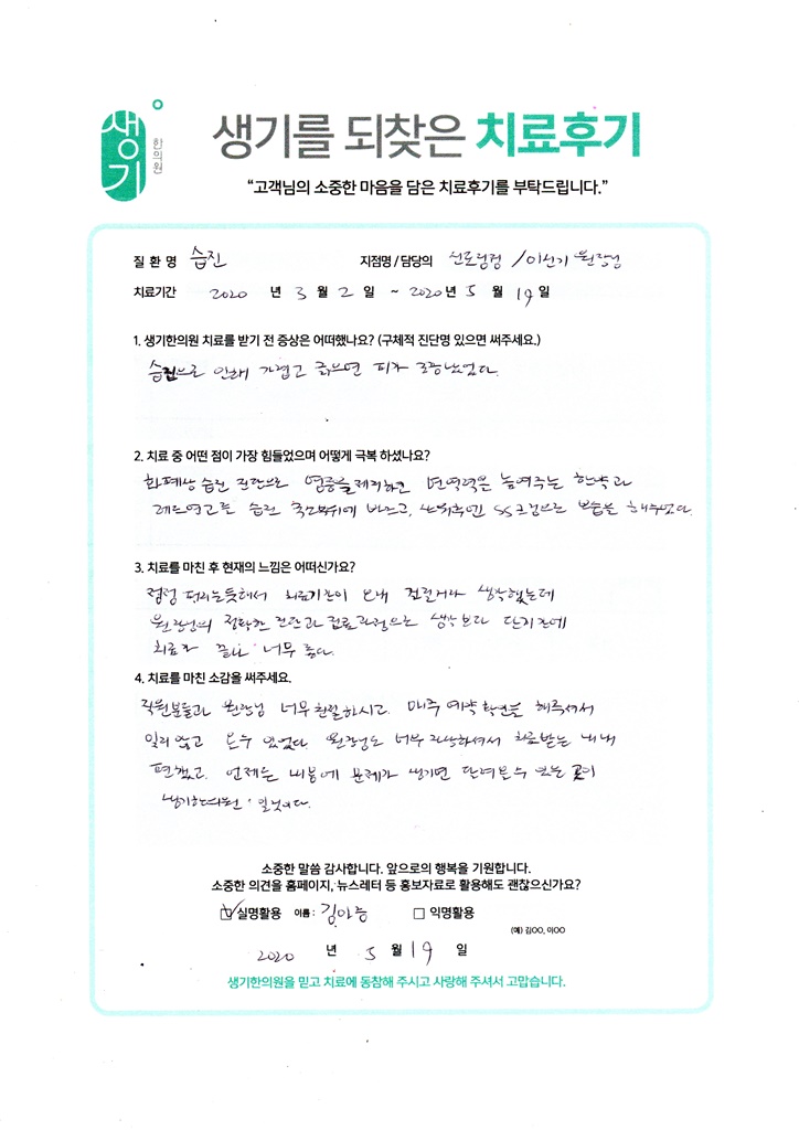 생기한의원과 함께하신 생생한 자필 및 영상 후기를 소개합니다.