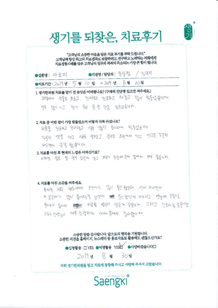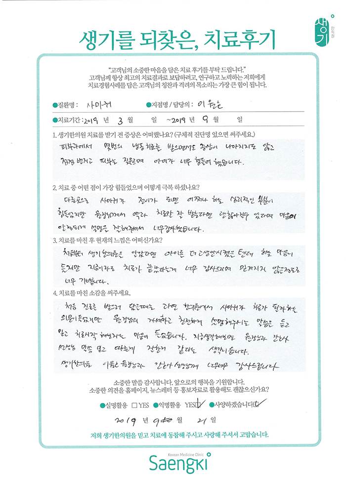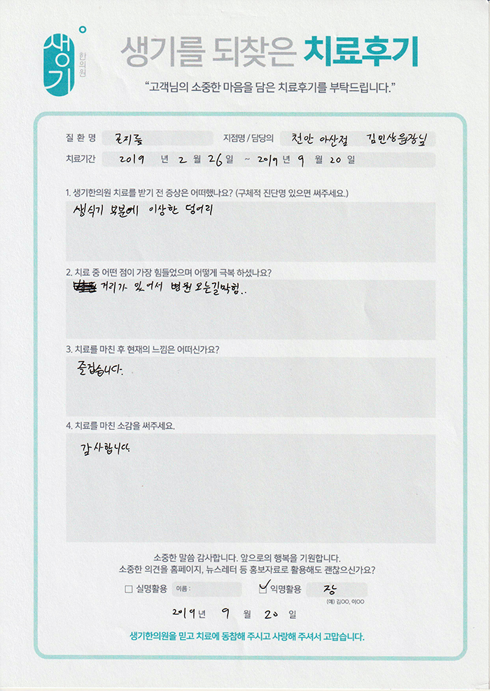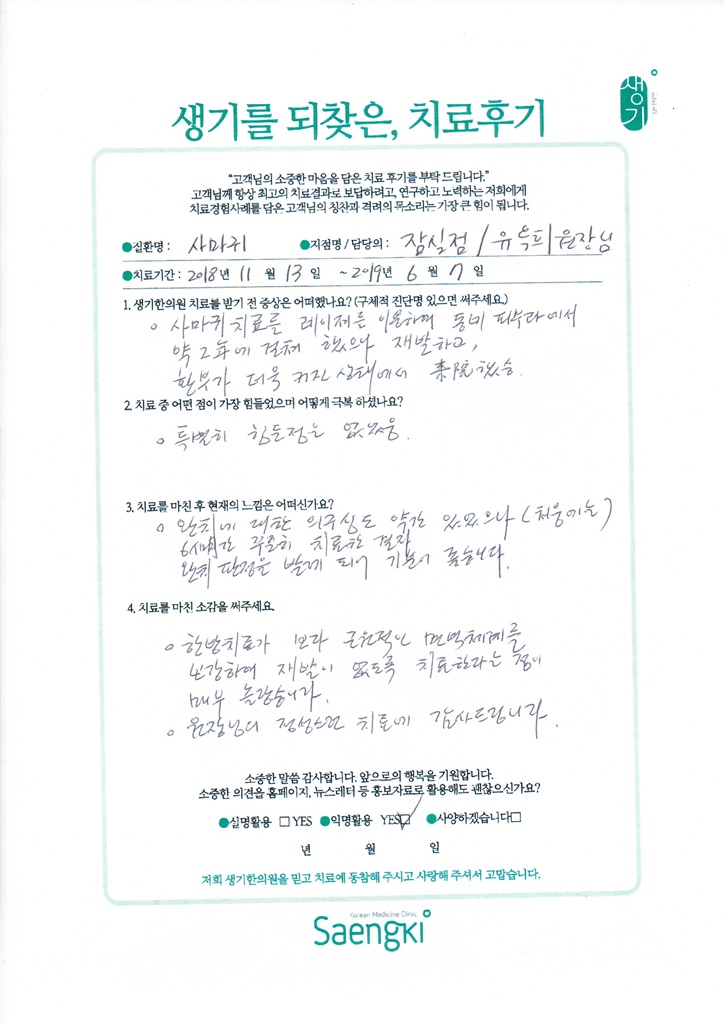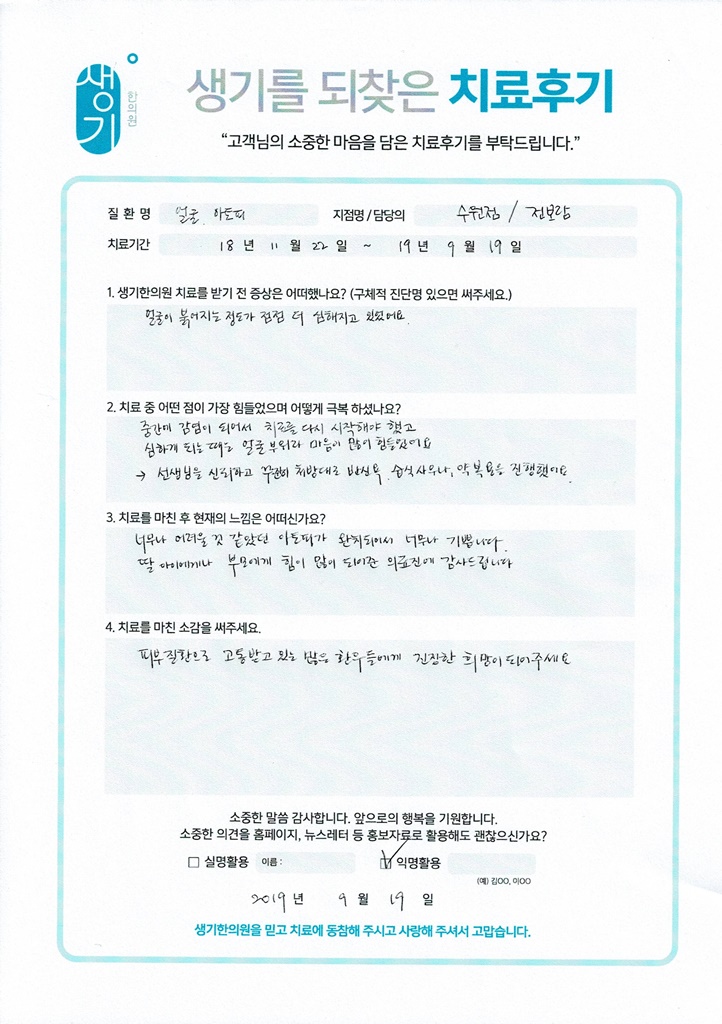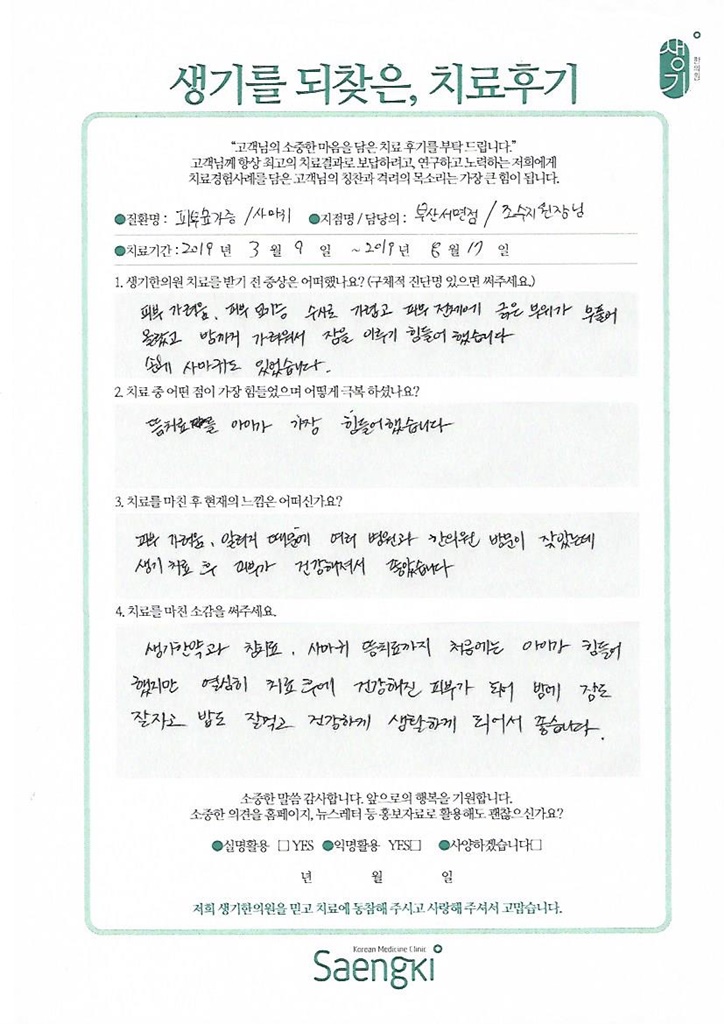생기한의원과 함께하신 생생한 자필 및 영상 후기를 소개합니다.