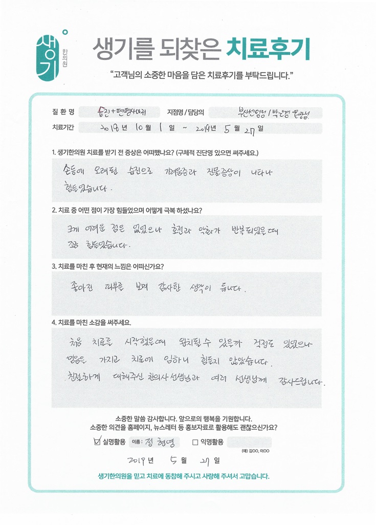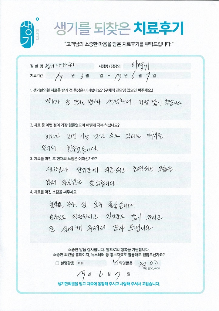 생기한의원과 함께하신 생생한 자필 및 영상 후기를 소개합니다.