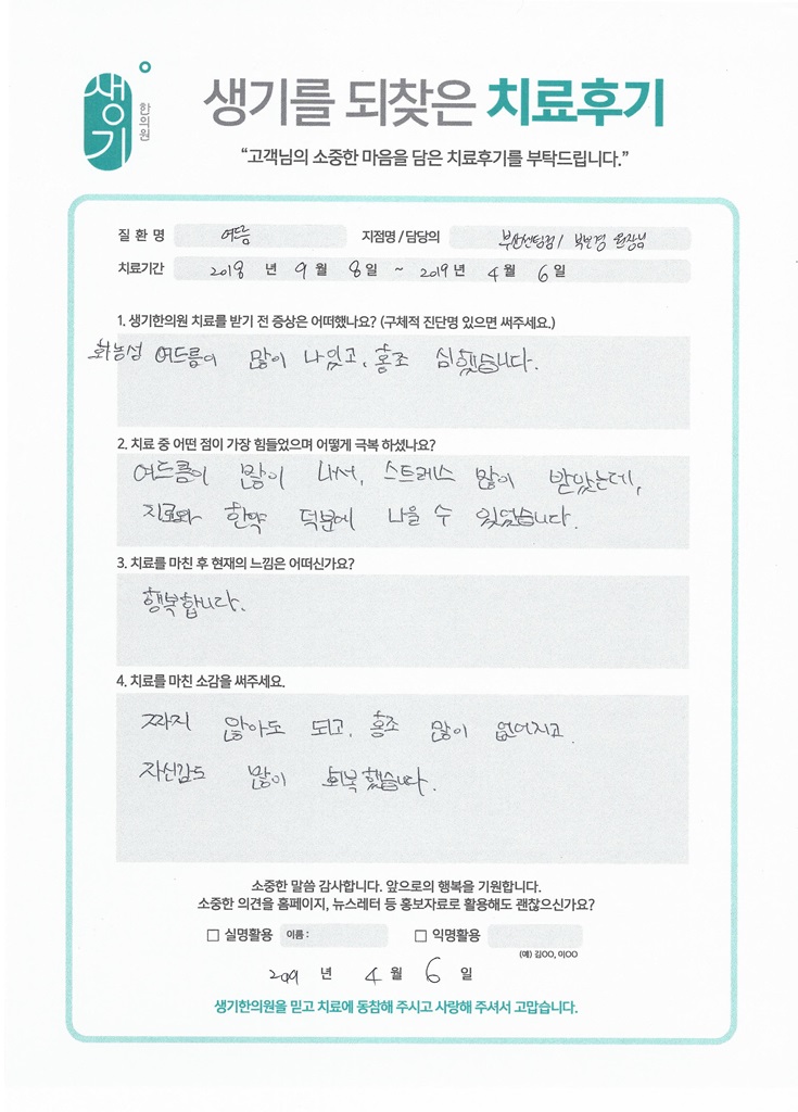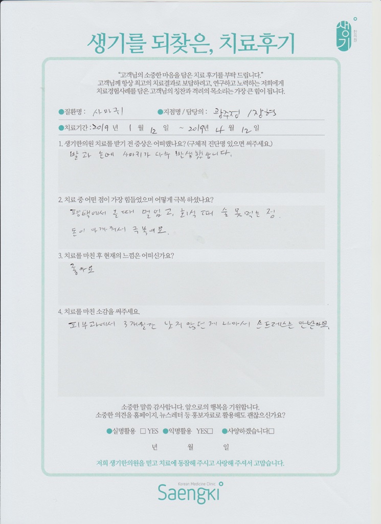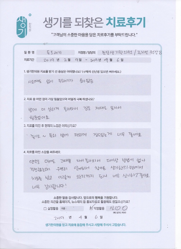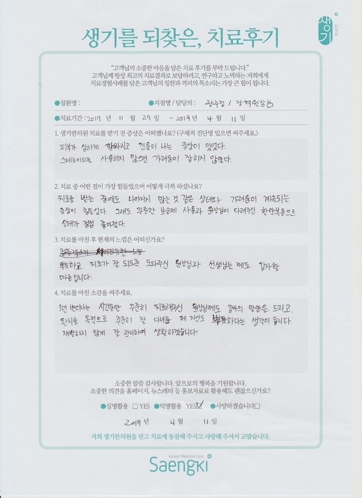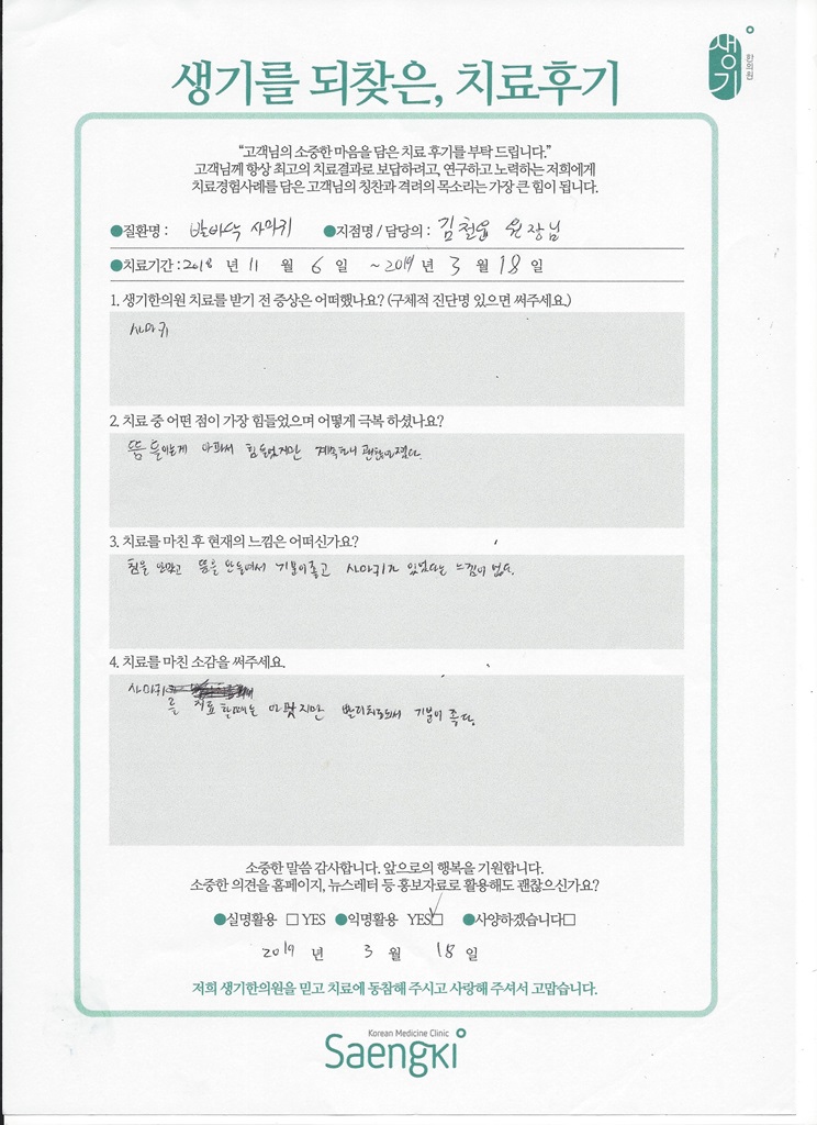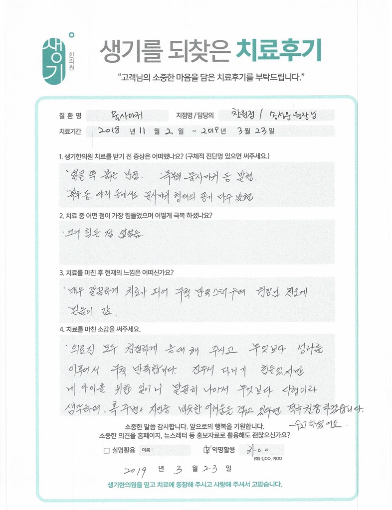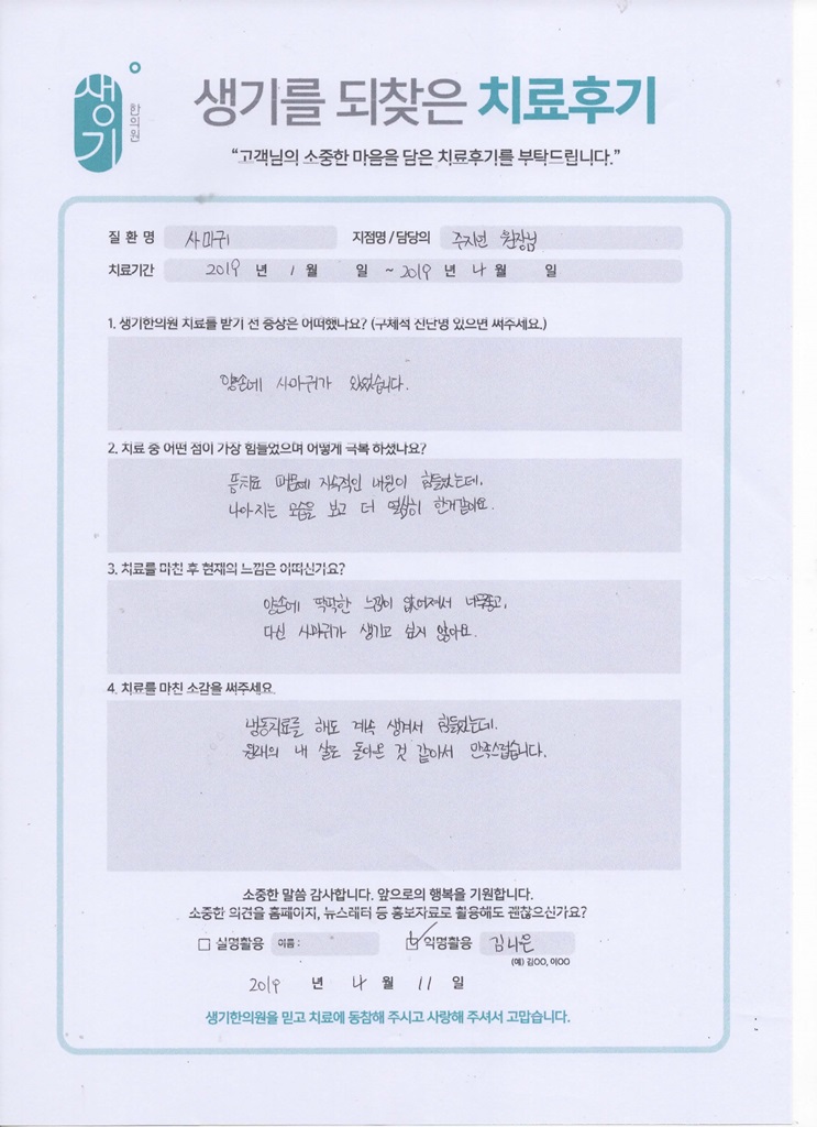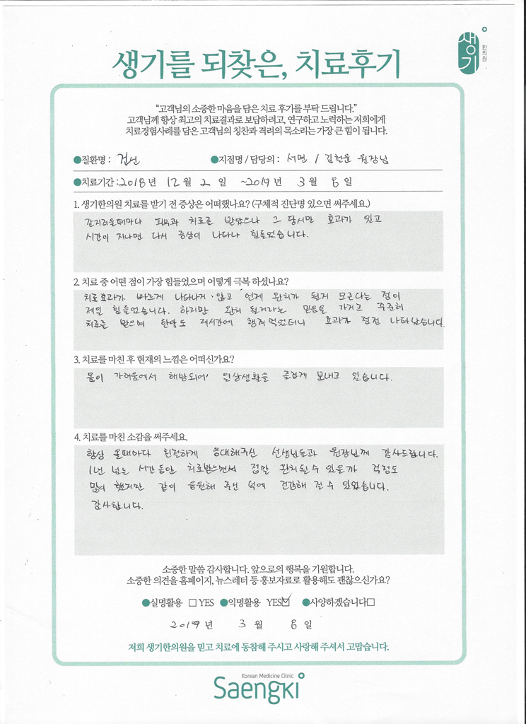 생기한의원과 함께하신 생생한 자필 및 영상 후기를 소개합니다.