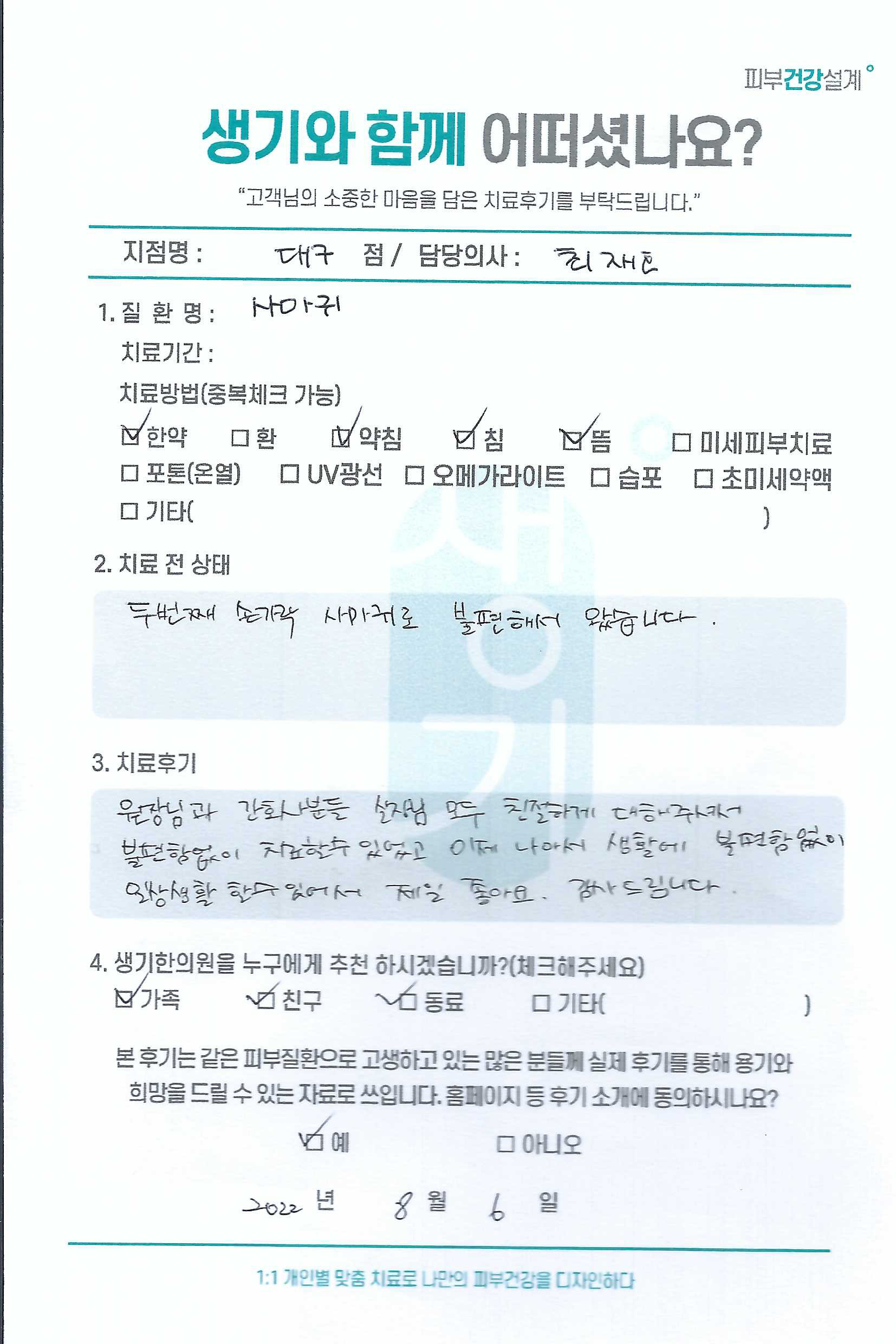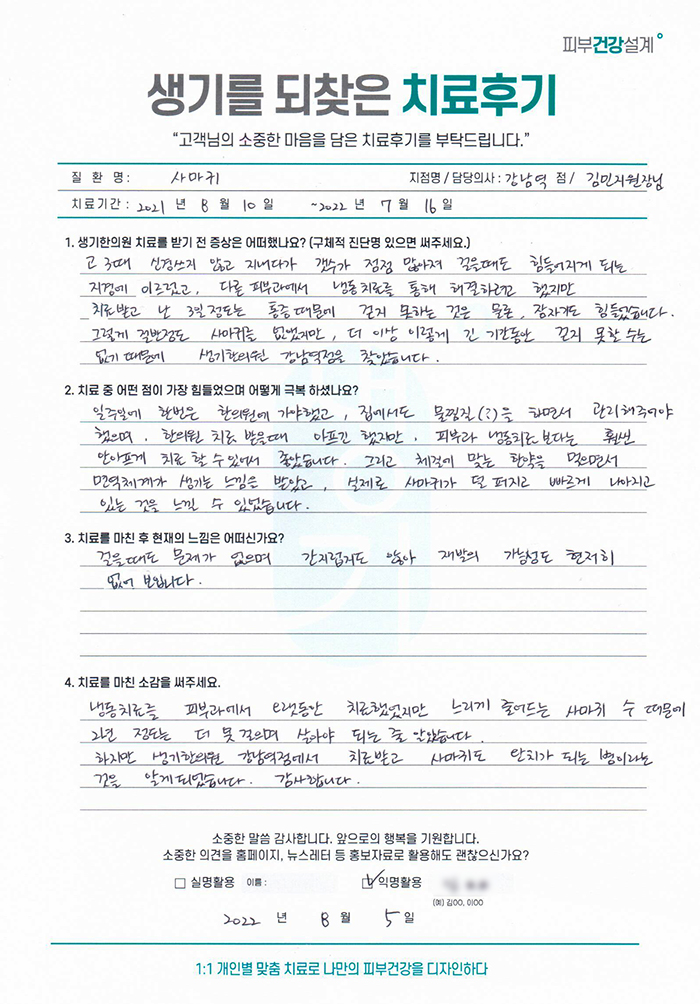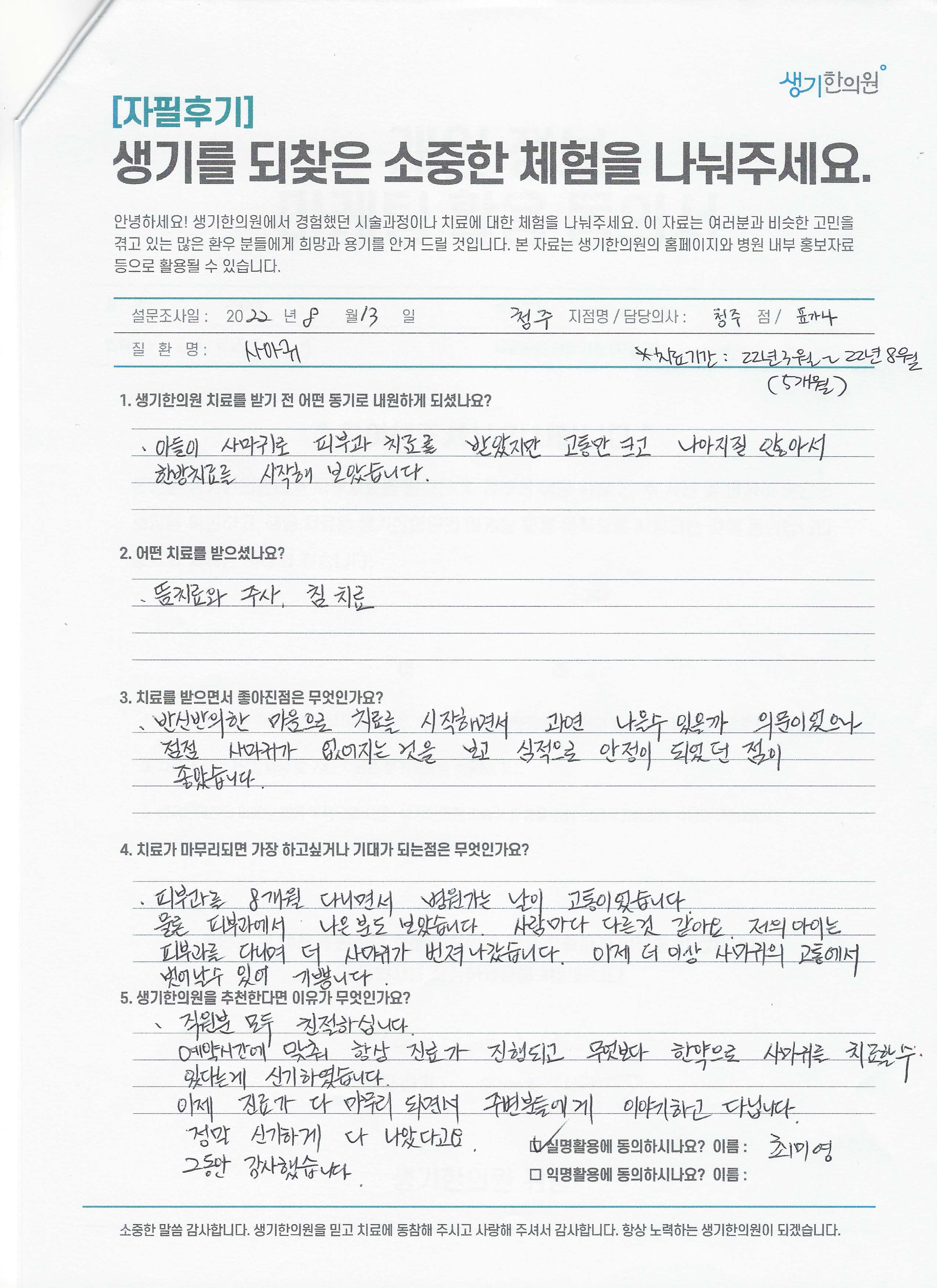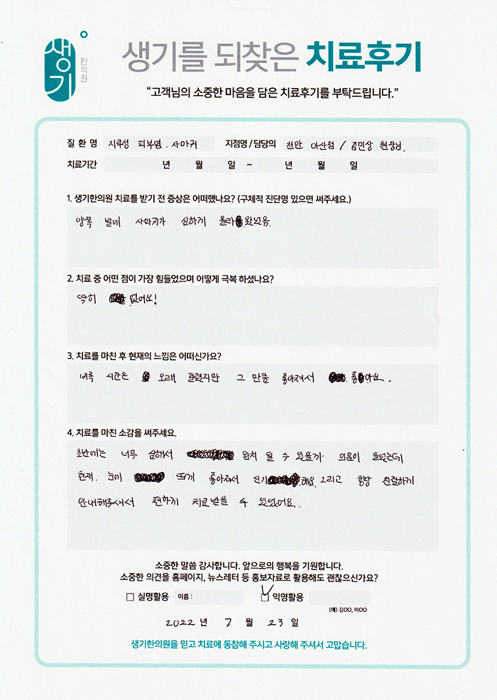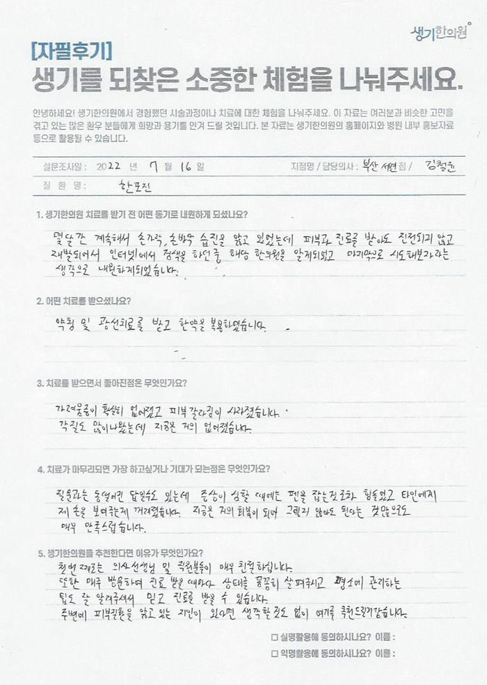 생기한의원과 함께하신 생생한 자필 및 영상 후기를 소개합니다.