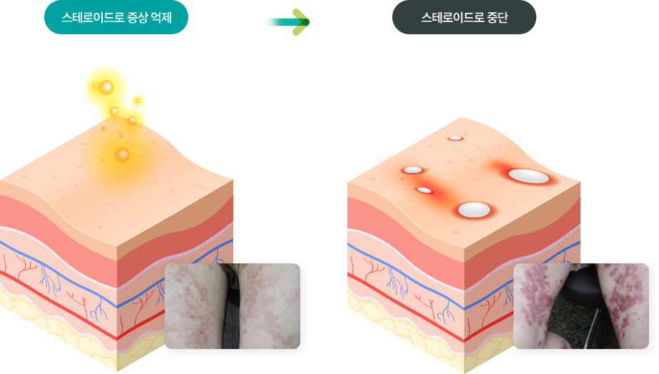 스테로이드 사용을 중단할 경우, 억제된 증상이 다시 나타나는 리바운드 현상과 면역력 저하로 인한
