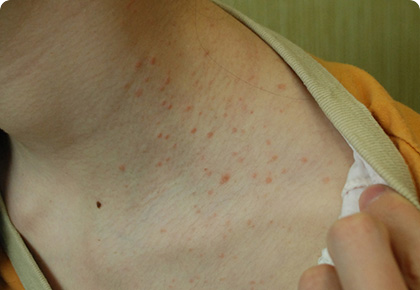 1~4mm 자잘하고 얇은 구진이 전신에 발생하며