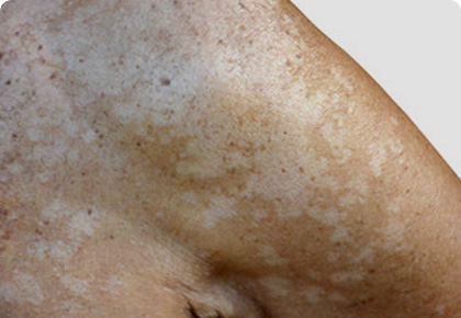 주로 상반신 다양한 부위에 여러 크기의 얼룩덜룩한 반점 형태의 병변이 발생합니다.